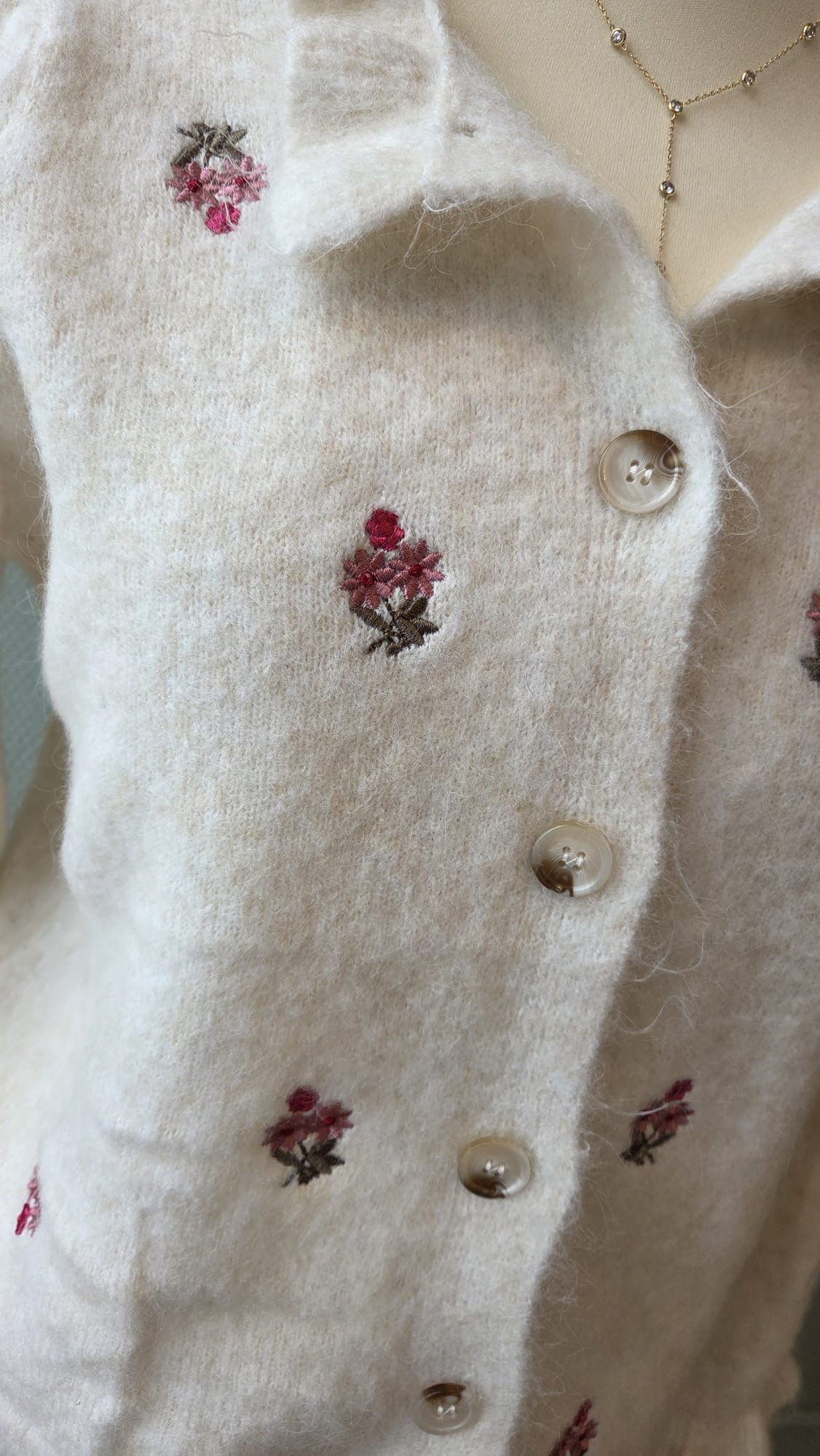 • Pull écru à motifs fleurs rose
