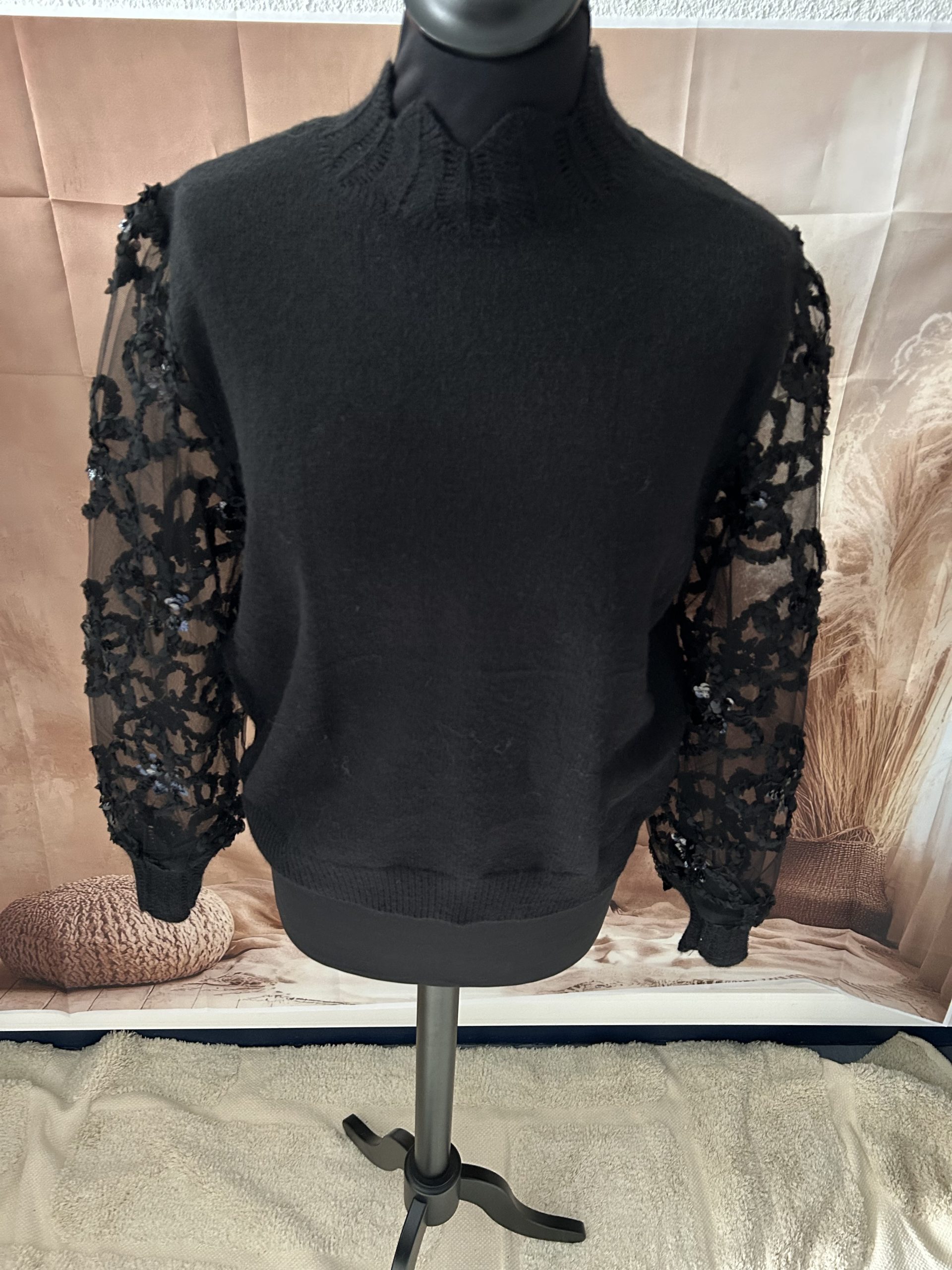 Pull noir col haut , avec manches transparentes motifs sequins