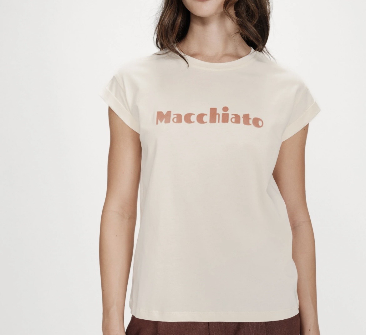 • Message imprimé en velours sur le devant  » Macchiato » en couleurs café