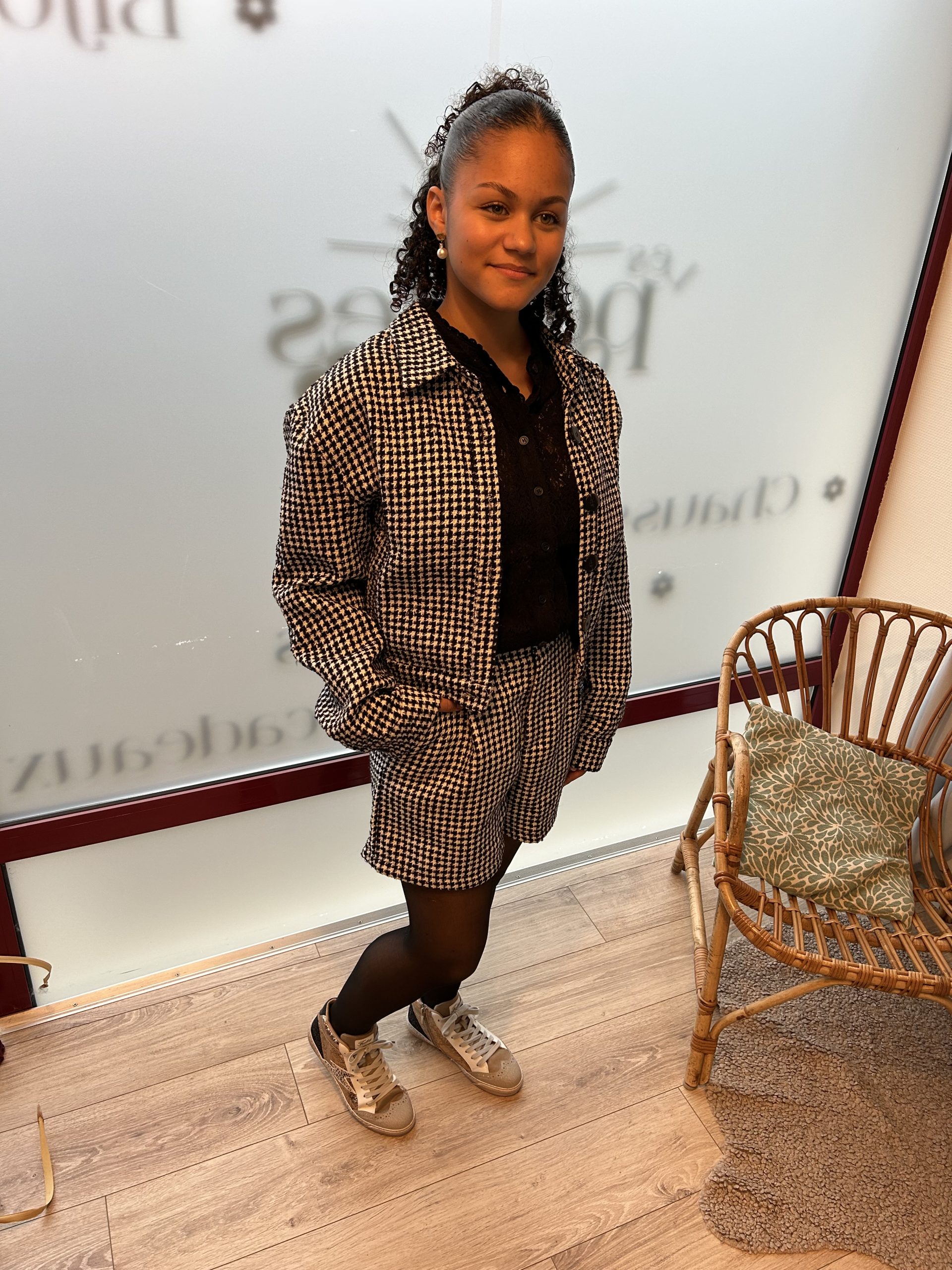Veste pied de poule noir avec un léger liseré doré .
